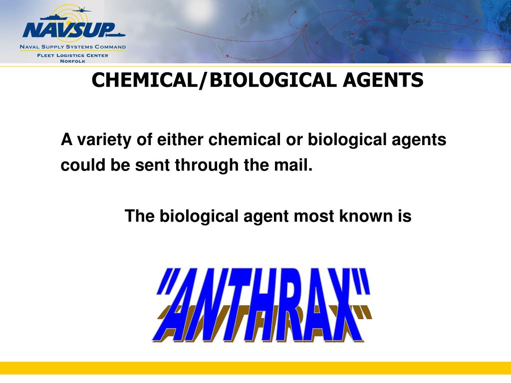 CHEMICAL/BIOLOGICAL AGENTS A variety of either chemical or biological agents could be sent through the mail. The biological agent most known is "ANTHRAX"