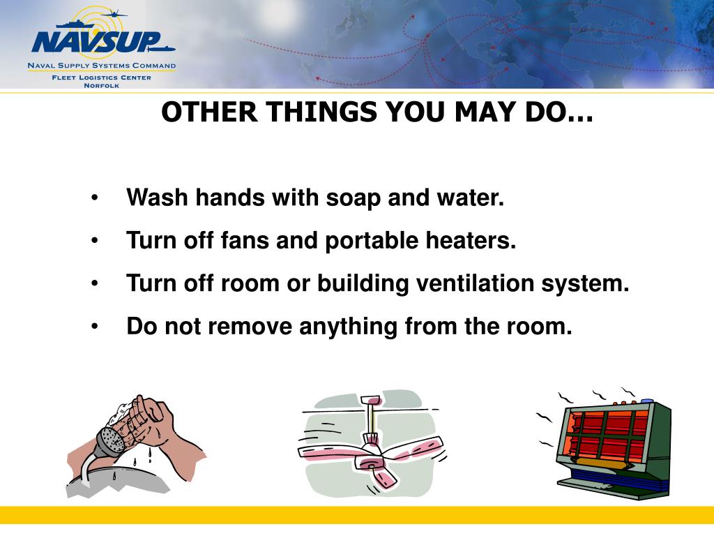 OTHER THINGS YOU MAY DO… • Wash hands with soap and water. • Turn off fans and portable heaters. • Turn off room or building ventilation system. • Do not remove anything from the room.