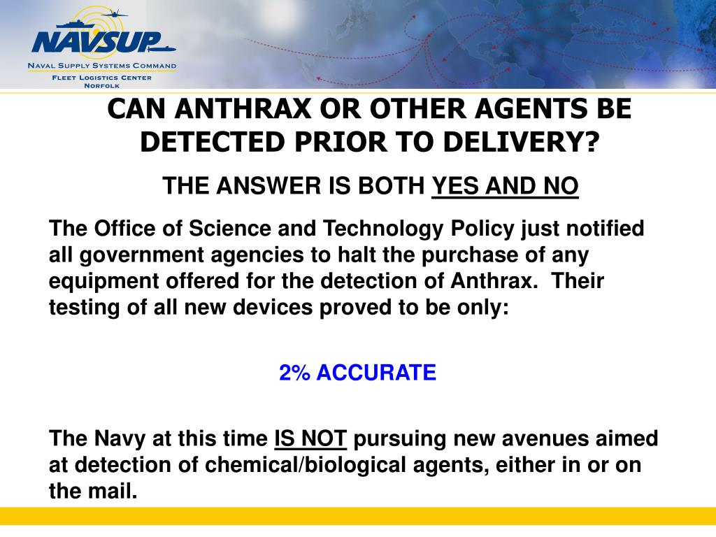 CAN ANTHRAX OR OTHER AGENTS BE DETECTED PRIOR TO DELIVERY? THE ANSWER IS BOTH YES AND NO The Office of Science and Technology Policy just notified all government agencies to halt the purchase of any equipment offered for the detection of Anthrax. Their testing of all new devices proved to be only: 2% ACCURATE The Navy at this time IS NOT pursuing new avenues aimed at detection of chemical/biological agents, either in or on the mail.