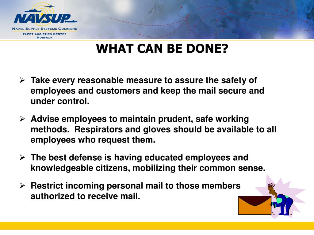 WHAT CAN BE DONE? • Take every reasonable measure to assure the safety of employees and customers and keep the mail secure and under control. • Advise employees to maintain prudent, safe working methods. Respirators and gloves should be available to all employees who request them. • The best defense is having educated employees and knowledgeable citizens, mobilizing their common sense. • Restrict incoming personal mail to those members authorized to receive mail.