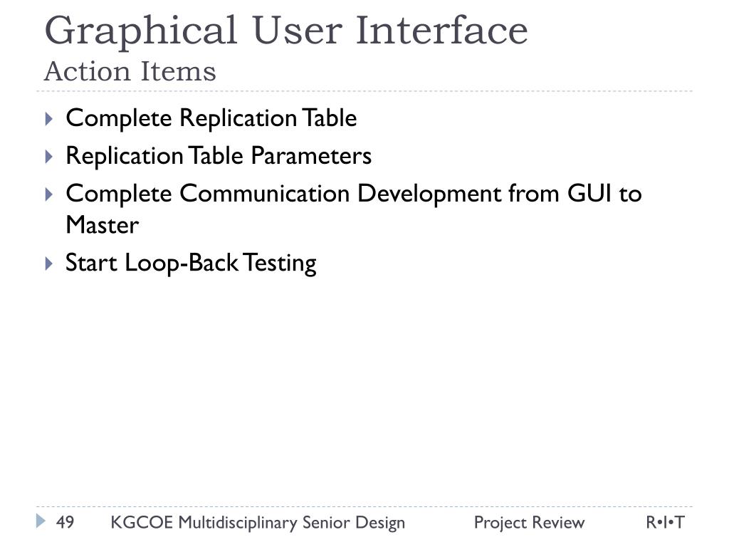 Graphical User InterfaceAction Items • Complete Replication Table • Replication Table Parameters • Complete Communication Development from GUI to Master • Start Loop-Back Testing KGCOE Multidisciplinary Senior Design