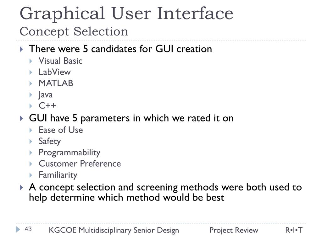 Graphical User InterfaceConcept Selection • There were 5 candidates for GUI creation • Visual Basic • LabView • MATLAB • Java • C++ • GUI have 5 parameters in which we rated it on • Ease of Use • Safety • Programmability • Customer Preference • Familiarity • A concept selection and screening methods were both used to help determine which method would be best KGCOE Multidisciplinary Senior Design