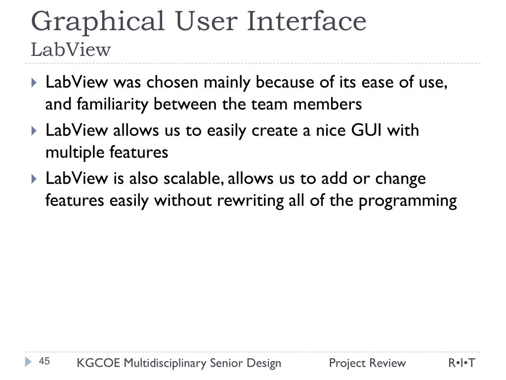 Graphical User InterfaceLabView • LabView was chosen mainly because of its ease of use, and familiarity between the team members • LabView allows us to easily create a nice GUI with multiple features • LabView is also scalable, allows us to add or change features easily without rewriting all of the programming KGCOE Multidisciplinary Senior Design