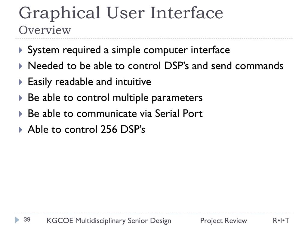 Graphical User InterfaceOverview • System required a simple computer interface • Needed to be able to control DSP’s and send commands • Easily readable and intuitive • Be able to control multiple parameters • Be able to communicate via Serial Port • Able to control 256 DSP’s KGCOE Multidisciplinary Senior Design