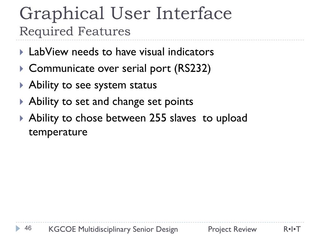 Graphical User InterfaceRequired Features • LabView needs to have visual indicators • Communicate over serial port (RS232) • Ability to see system status • Ability to set and change set points • Ability to chose between 255 slaves to upload temperature KGCOE Multidisciplinary Senior Design