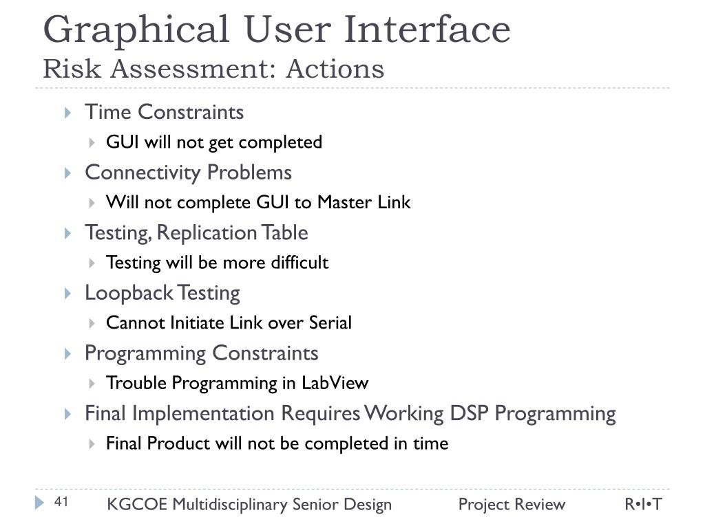 Graphical User InterfaceRisk Assessment: Risks • Time Constraints • Connectivity Problems • Testing, Replication Table • Loopback Testing • Programming Constraints • Final Implementation Requires Working DSP Programming KGCOE Multidisciplinary Senior Design