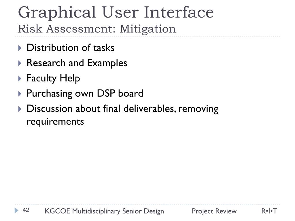 Graphical User InterfaceRisk Assessment: Mitigation • Distribution of tasks • Research and Examples • Faculty Help • Purchasing own DSP board • Discussion about final deliverables, removing requirements KGCOE Multidisciplinary Senior Design