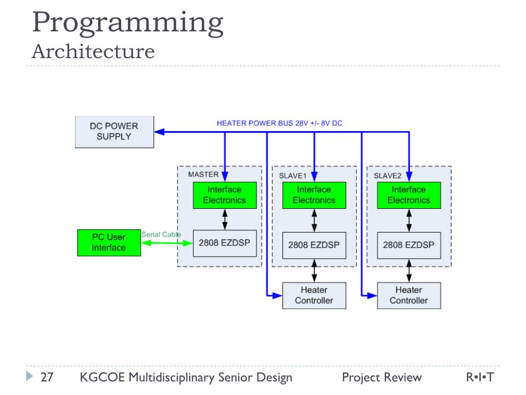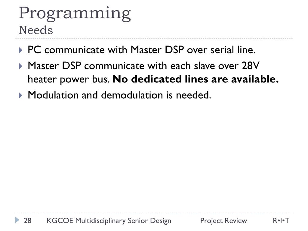 ProgrammingNeeds • PC communicate with Master DSP over serial line. • Master DSP communicate with each slave over 28V heater power bus. No dedicated lines are available. • Modulation and demodulation is needed. KGCOE Multidisciplinary Senior Design