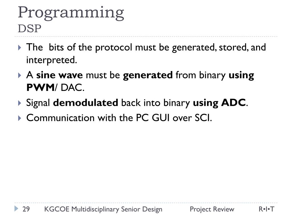 Programming DSP • The bits of the protocol must be generated, stored, and interpreted. • A sine wave must be generated from binary usingPWM/ DAC. • Signal demodulated back into binary usingADC. • Communication with the PC GUI over SCI. KGCOE Multidisciplinary Senior Design