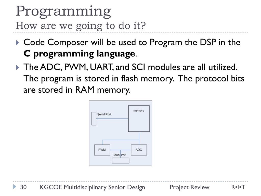 ProgrammingHow are we going to do it? • Code Composer will be used to Program the DSP in the C programming language. • The ADC, PWM, UART, and SCI modules are all utilized. The program is stored in flash memory. The protocol bits are stored in RAM memory. KGCOE Multidisciplinary Senior Design