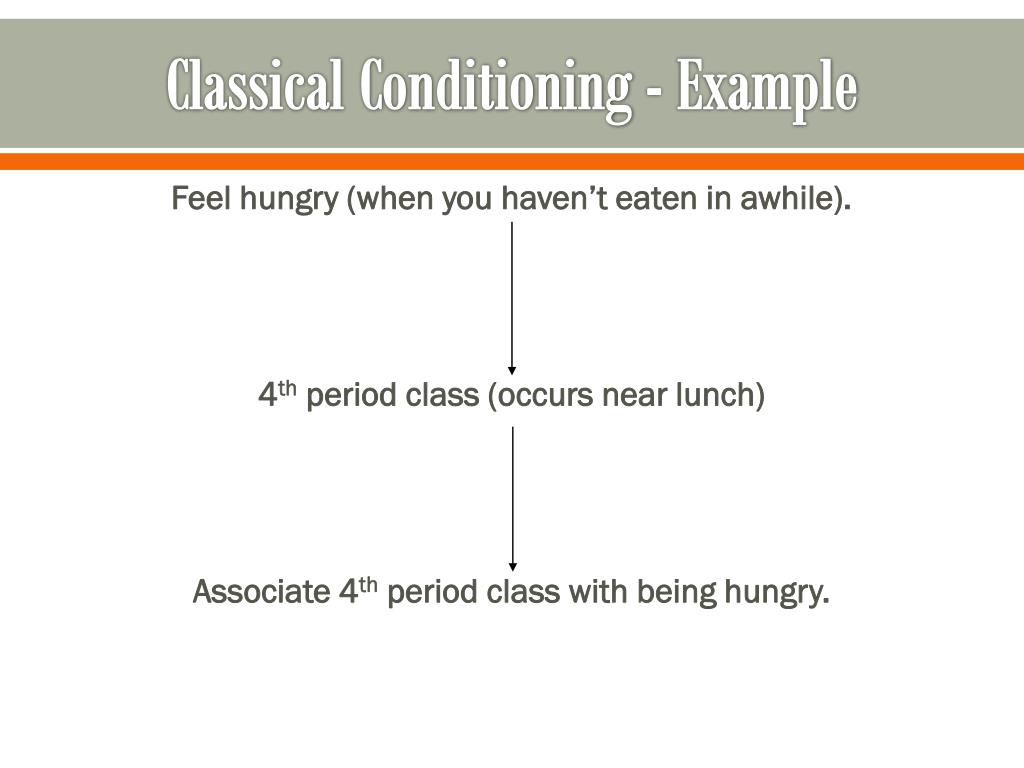 Classical Conditioning - Example Feel hungry (when you haven’t eaten in awhile). 4th period class (occurs near lunch) Associate 4th period class with being hungry.