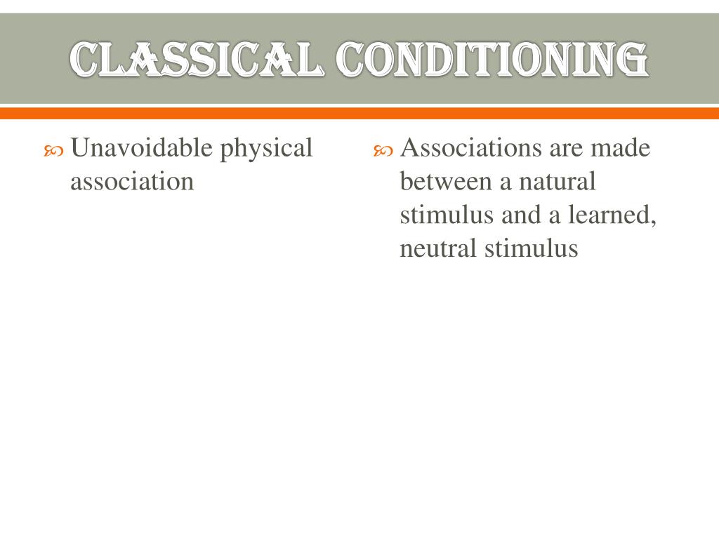 Unavoidable physical association Associations are made between a natural stimulus and a learned, neutral stimulus Classical Conditioning