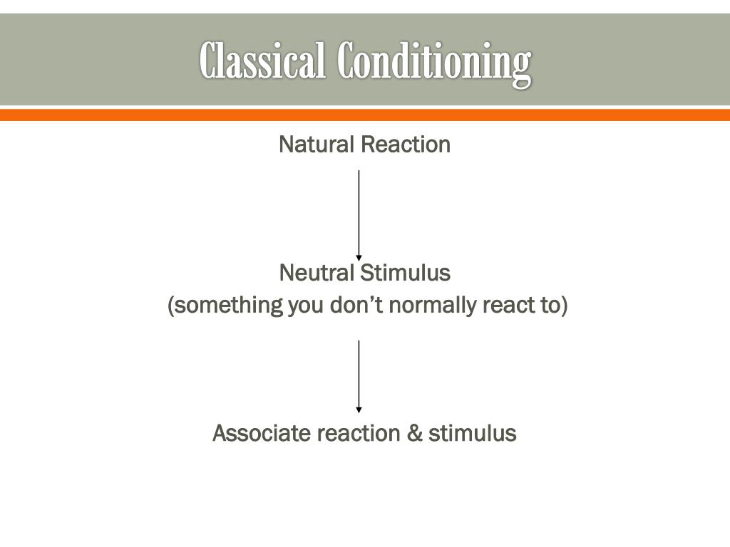 Classical Conditioning Natural Reaction Neutral Stimulus (something you don’t normally react to) Associate reaction & stimulus