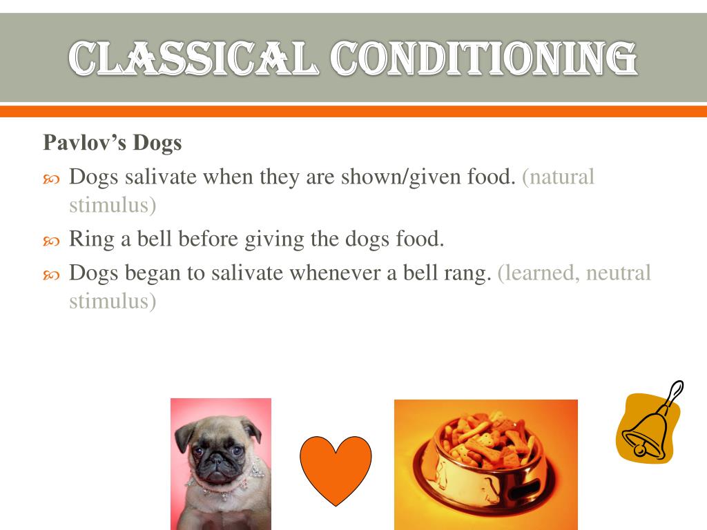 Classical Conditioning Pavlov’s Dogs • Dogs salivate when they are shown/given food. (natural stimulus) • Ring a bell before giving the dogs food. • Dogs began to salivate whenever a bell rang. (learned, neutral stimulus)