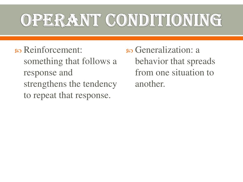 Reinforcement: something that follows a response and strengthens the tendency to repeat that response. Generalization: a behavior that spreads from one situation to another. Operant Conditioning