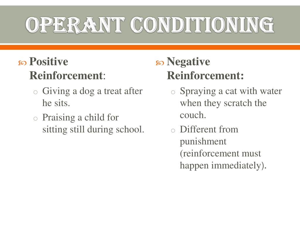 Positive Reinforcement: Giving a dog a treat after he sits. Praising a child for sitting still during school. Negative Reinforcement: Spraying a cat with water when they scratch the couch. Different from punishment (reinforcement must happen immediately). Operant Conditioning