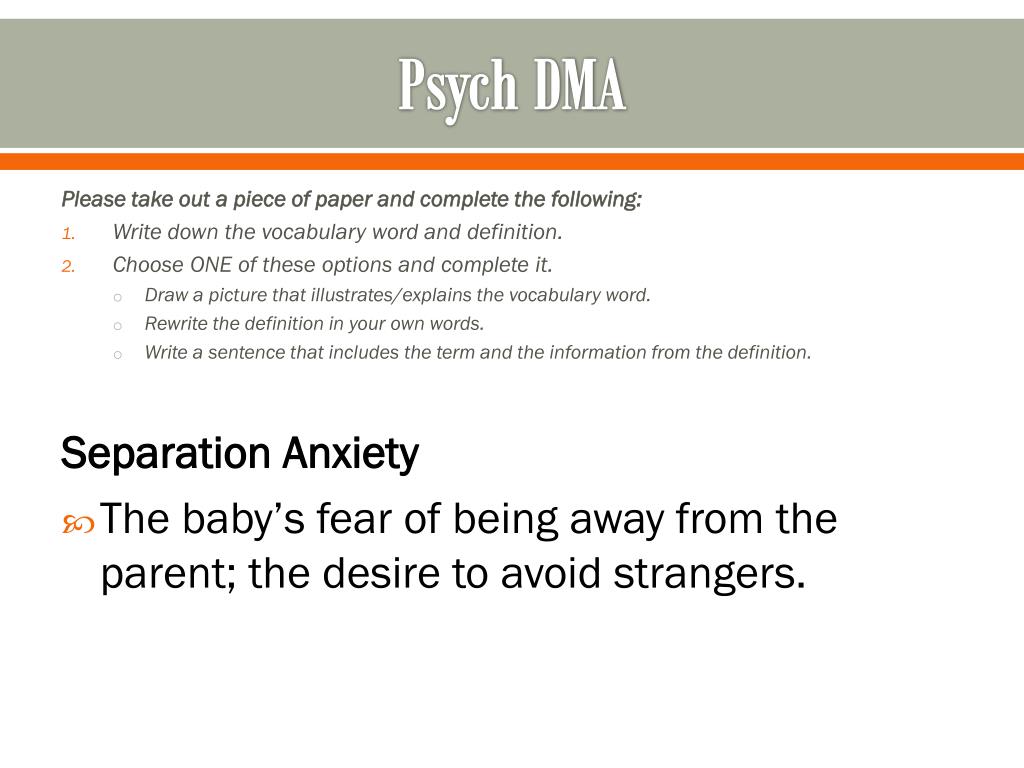 Psych DMA Please take out a piece of paper and complete the following: • Write down the vocabulary word and definition. • Choose ONE of these options and complete it. • Draw a picture that illustrates/explains the vocabulary word. • Rewrite the definition in your own words. • Write a sentence that includes the term and the information from the definition. Separation Anxiety • The baby’s fear of being away from the parent; the desire to avoid strangers.