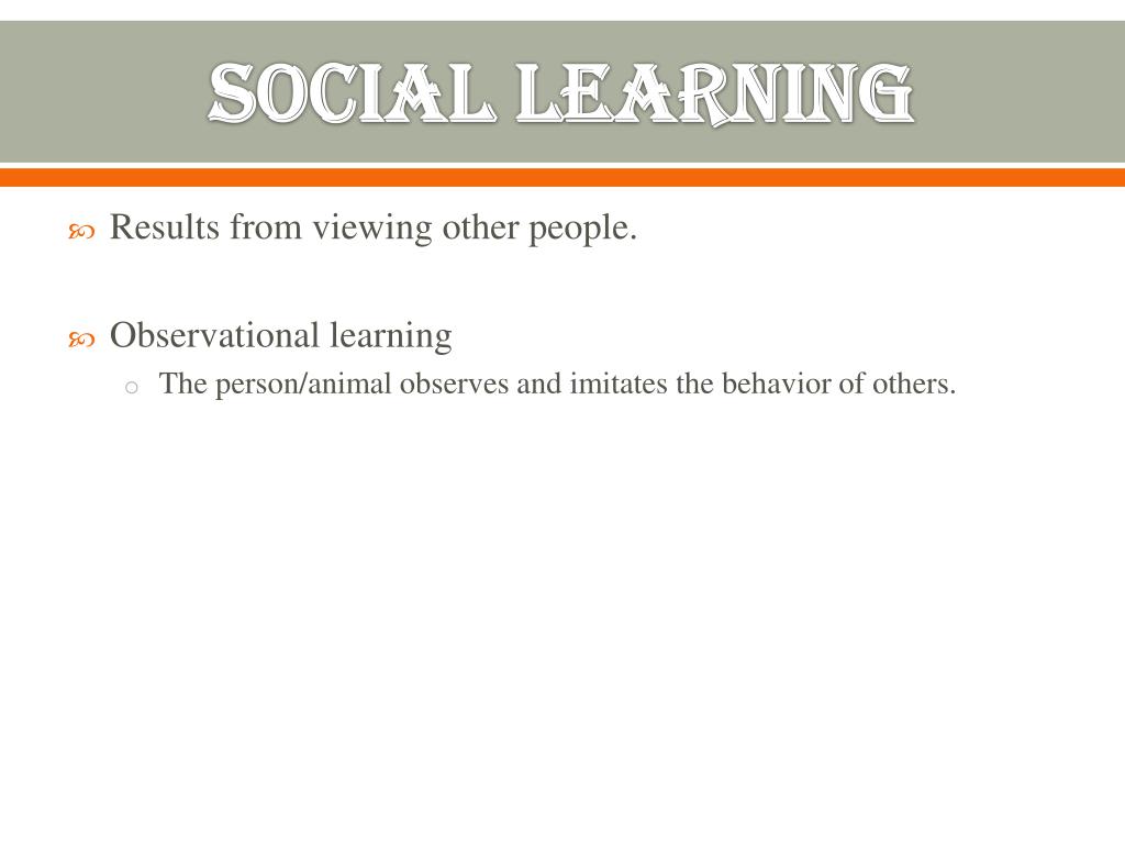 Social Learning • Results from viewing other people. • Observational learning • The person/animal observes and imitates the behavior of others.