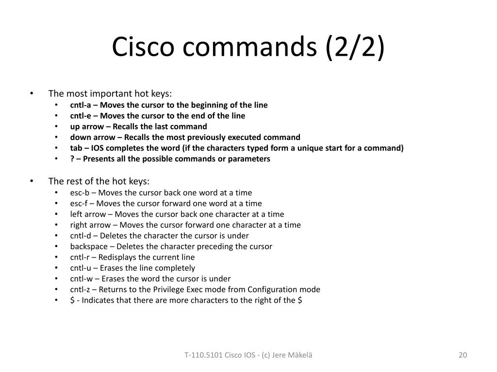 Ciscocommands (2/2) • The mostimportanthotkeys: • cntl-a – Moves the cursor to the beginning of the line • cntl-e – Moves the cursor to the end of the line • uparrow – Recalls the lastcommand • downarrow – Recalls the mostpreviouslyexecutedcommand • tab – IOS completes the word (if the characterstypedform a uniquestart for a command) • ? – Presentsall the possiblecommandsorparameters • The rest of the hotkeys: • esc-b – Moves the cursorbackoneword at a time • esc-f – Moves the cursorforwardoneword at a time • leftarrow – Moves the cursorbackonecharacter at a time • rightarrow – Moves the cursorforwardonecharacter at a time • cntl-d – Deletes the character the cursor is under • backspace – Deletes the characterpreceding the cursor • cntl-r – Redisplays the currentline • cntl-u – Erases the linecompletely • cntl-w – Erases the word the cursor is under • cntl-z – Returns to the PrivilegeExecmodefromConfigurationmode • $ - Indicatesthattherearemorecharacters to the right of the $ T-110.5101 Cisco IOS - (c) Jere Mäkelä