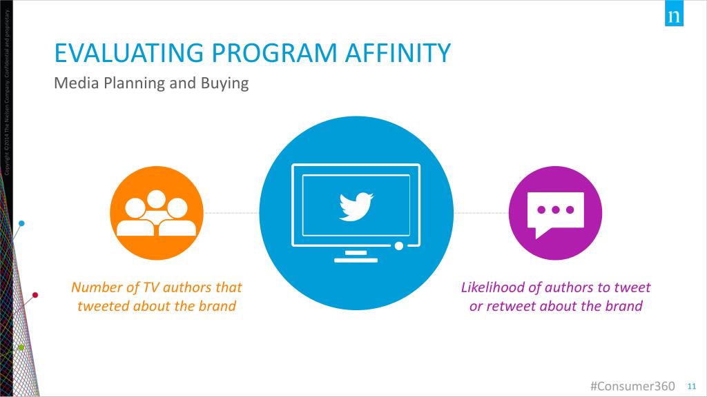 Evaluating program affinity Media Planning and Buying Number of TV authors that tweeted about the brand Likelihood of authors to tweet or retweet about the brand #Consumer360
