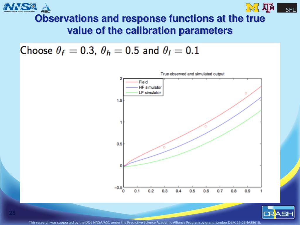 Have deployed state of the art UQ techniques to leverage CRASH codes and experiments • Use the model calibration framework to perform a variety of tasks such as explore the simulation response surfaces, making predictions for experiments and sensitivity analysis • Developed new statistical model for calibration of multi-fidelity computer models with field data • Can make predictions with associated uncertainty informed by multi-fidelity models • Developing model to combine several codes (not necessarily ranked by fidelity) and observations