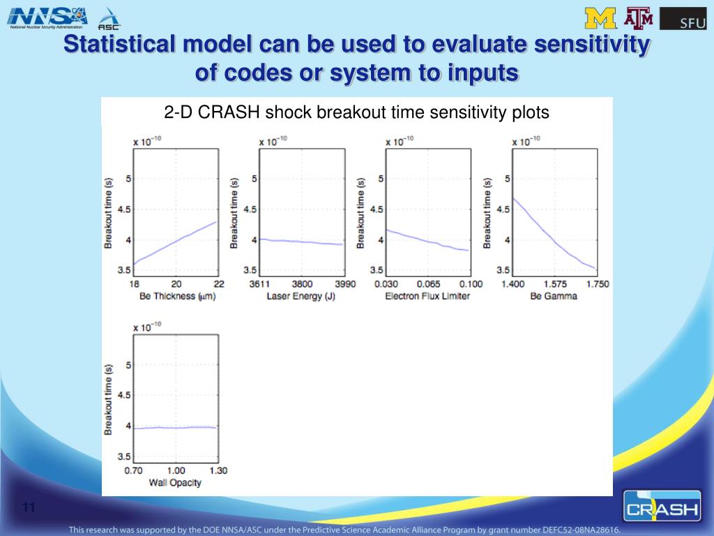 Statistical model can be used to evaluate sensitivity of codes or system to inputs 2-D CRASH shock breakout time sensitivity plots