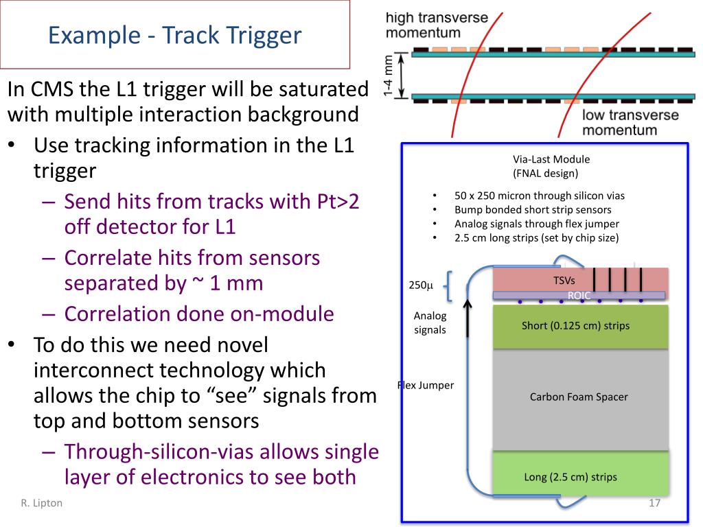 Example - Track Trigger Via-Last Module (FNAL design) • 50 x 250 micron through silicon vias • Bump bonded short strip sensors • Analog signals through flex jumper • 2.5 cm long strips (set by chip size) In CMS the L1 trigger will be saturated with multiple interaction background • Use tracking information in the L1 trigger • Send hits from tracks with Pt>2 off detector for L1 • Correlate hits from sensors separated by ~ 1 mm • Correlation done on-module • To do this we need novel interconnect technology which allows the chip to “see” signals from top and bottom sensors • Through-silicon-vias allows single layer of electronics to see both TSVs 250m ROIC Analog signals Short (0.125 cm) strips Short (1.25 mm) strips Flex Jumper Carbon Foam Spacer Long (2.5 cm) strips