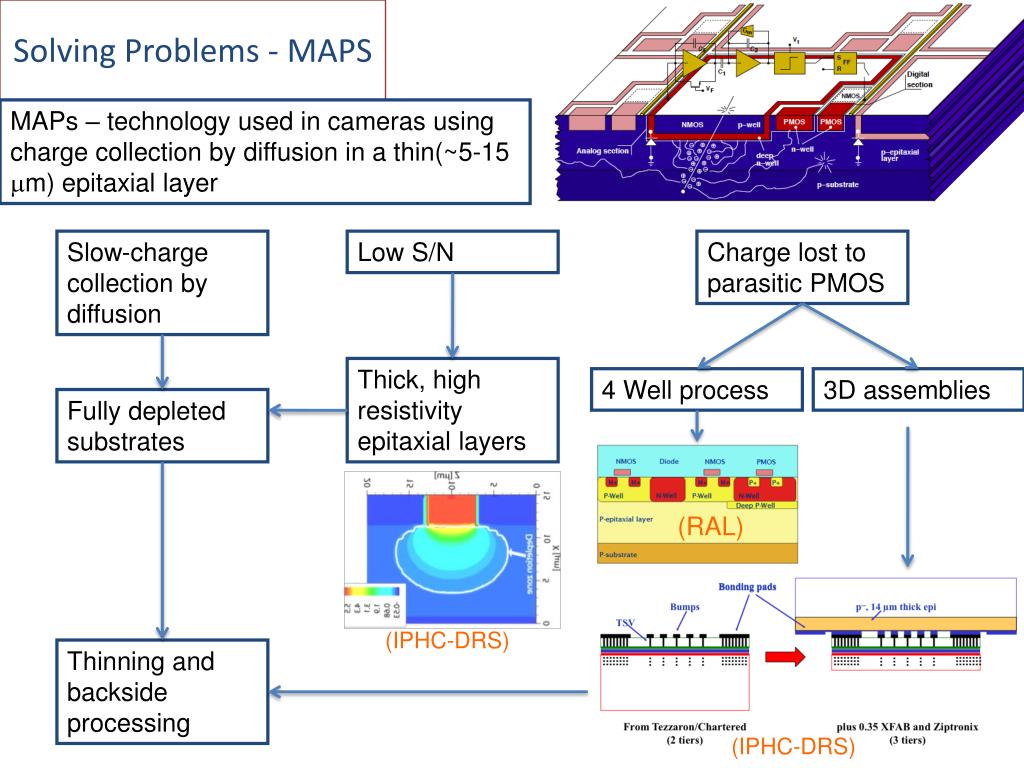 Solving Problems - MAPS MAPs – technology used in cameras using charge collection by diffusion in a thin(~5-15 mm) epitaxial layer Slow-charge collection by diffusion Low S/N Charge lost to parasitic PMOS Thick, high resistivity epitaxial layers 4 Well process 3D assemblies Fully depleted substrates (RAL) (IPHC-DRS) Thinning and backside processing (IPHC-DRS)