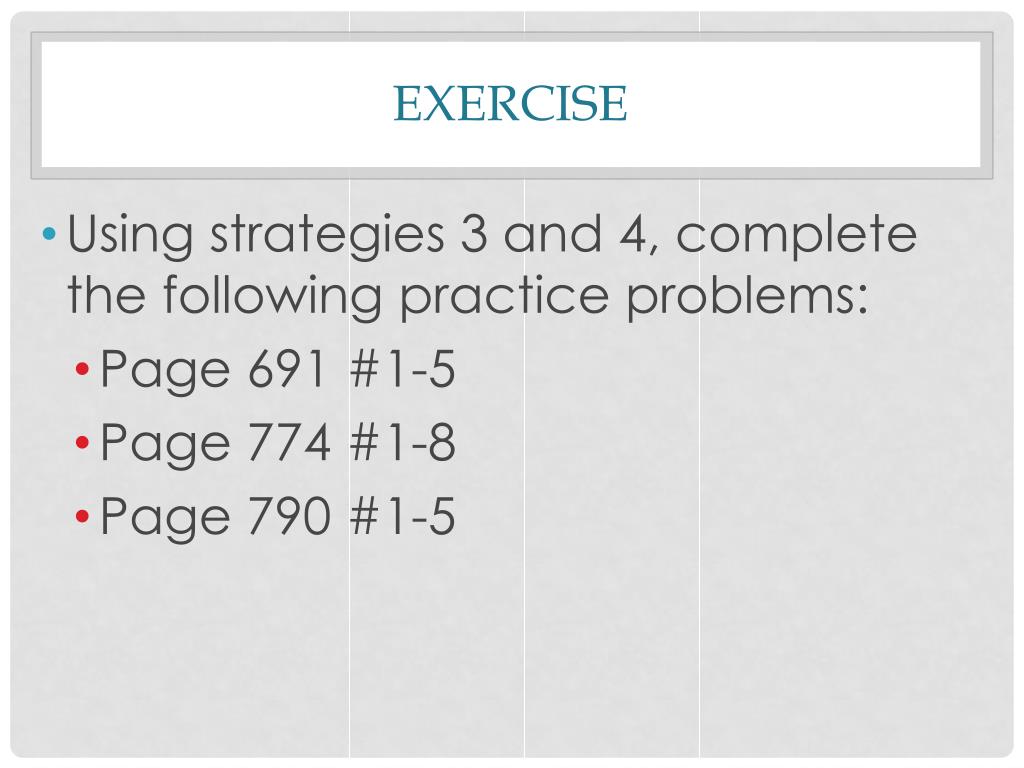 exercise • Using strategies 3 and 4, complete the following practice problems: • Page 691 #1-5 • Page 774 #1-8 • Page 790 #1-5