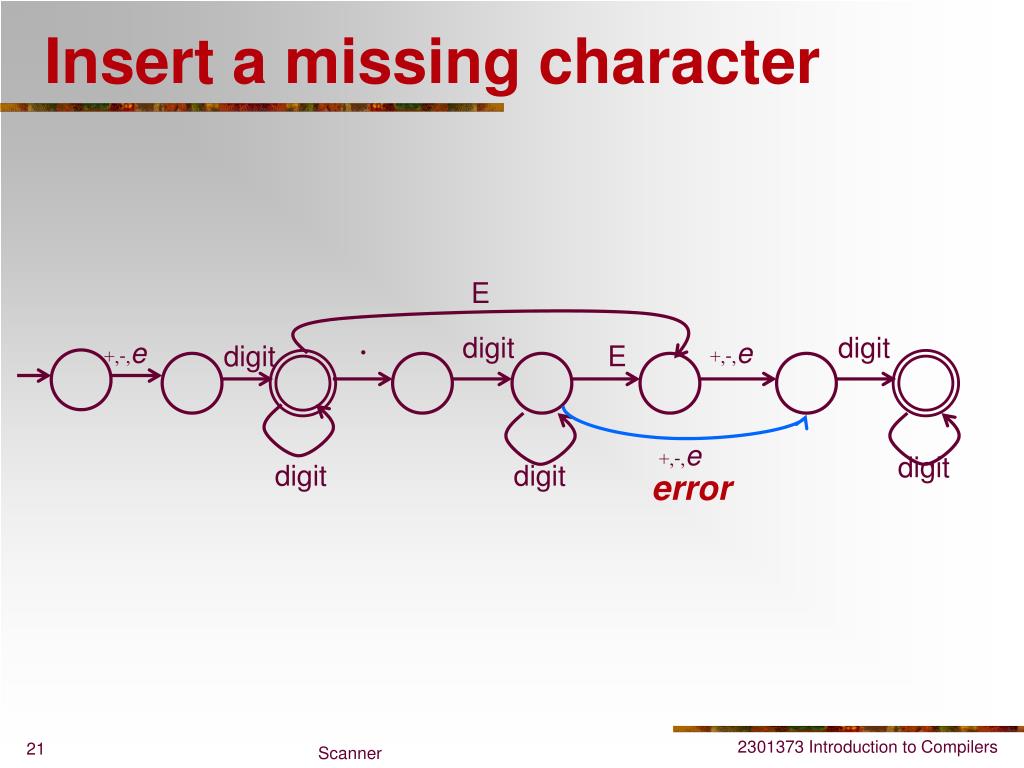 Insert a missing character E . digit digit +,-,e +,-,e digit E +,-,e digit digit digit error 2301373 Introduction to Compilers