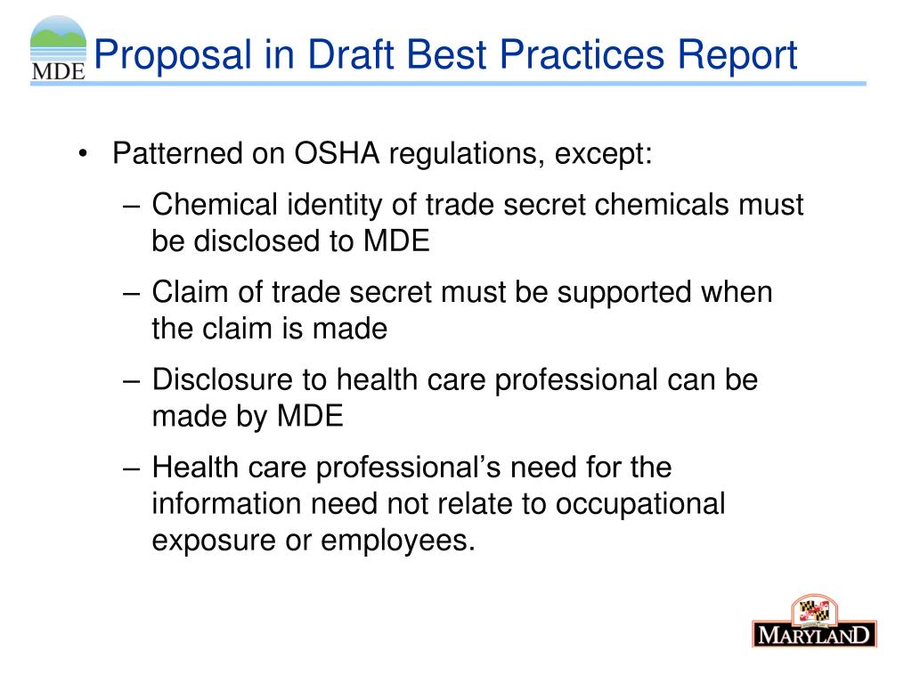 Proposal in Draft Best Practices Report • Patterned on OSHA regulations, except: • Chemical identity of trade secret chemicals must be disclosed to MDE • Claim of trade secret must be supported when the claim is made • Disclosure to health care professional can be made by MDE • Health care professional’s need for the information need not relate to occupational exposure or employees.