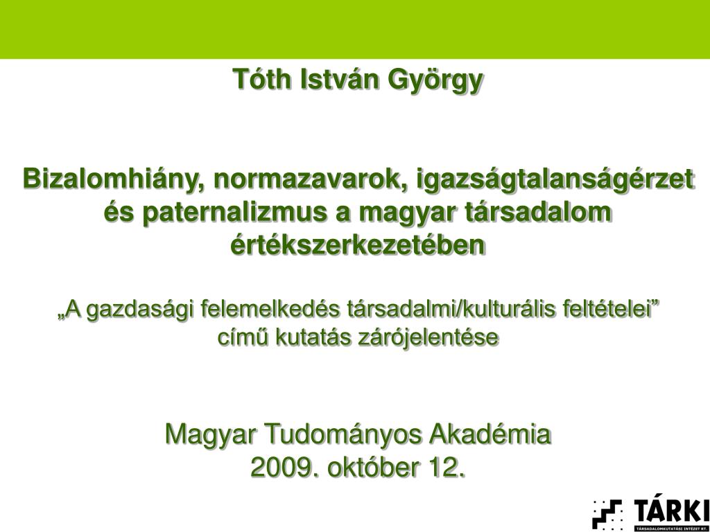 Tóth István György Bizalomhiány, normazavarok, igazságtalanságérzet és paternalizmus a magyar társadalom értékszerkezetében „A gazdasági felemelkedés társadalmi/kulturális feltételei” című kutatás zárójelentése Magyar Tudományos Akadémia 2009. október 12. A kutatás kérdései: