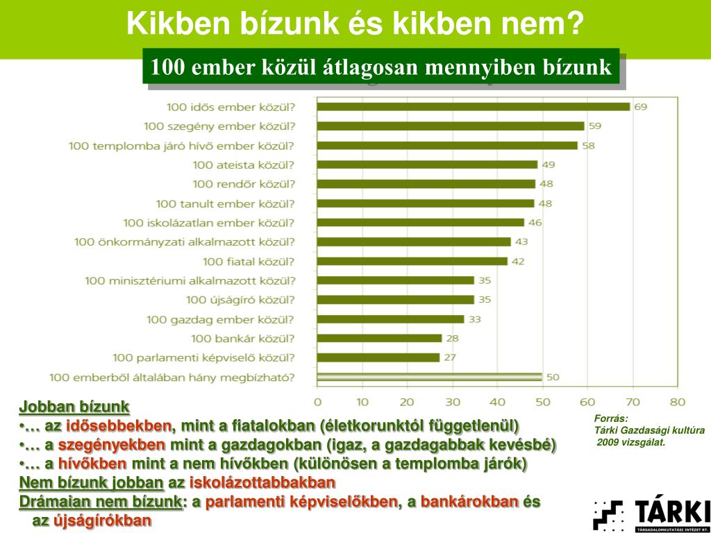 Kikben bízunk és kikben nem? 100 ember közül átlagosan mennyiben bízunk • Jobban bízunk • … az idősebbekben, mint a fiatalokban (életkorunktól függetlenül) • … a szegényekben mint a gazdagokban (igaz, a gazdagabbak kevésbé) • … a hívőkben mint a nem hívőkben (különösen a templomba járók) • Nem bízunk jobban az iskolázottabbakban • Drámaian nem bízunk: a parlamenti képviselőkben, a bankárokban és • az újságírókban Forrás: Tárki Gazdasági kultúra 2009 vizsgálat.