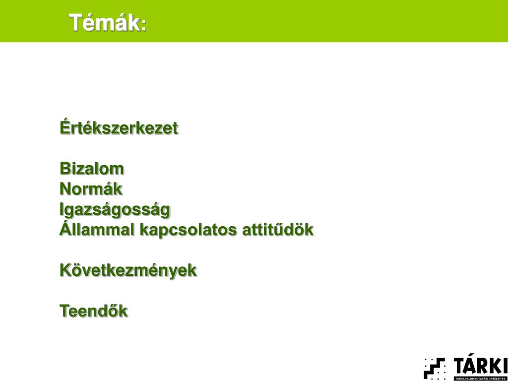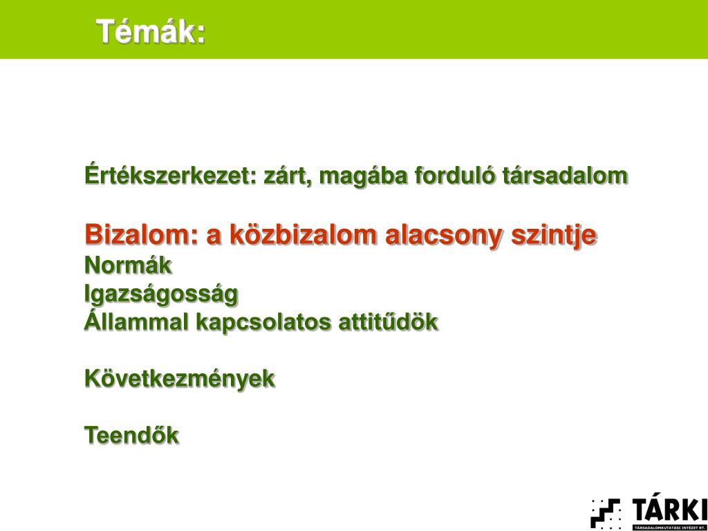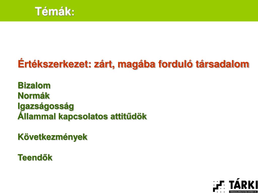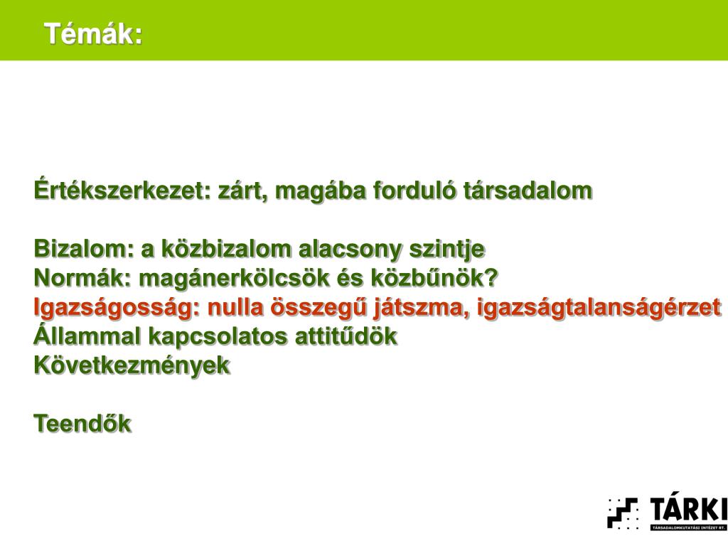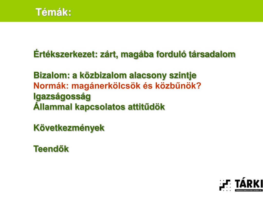 Témák: Értékszerkezet: zárt, magába forduló társadalom Bizalom: a közbizalom alacsony szintje Normák Igazságosság Állammal kapcsolatos attitűdök Következmények Teendők
