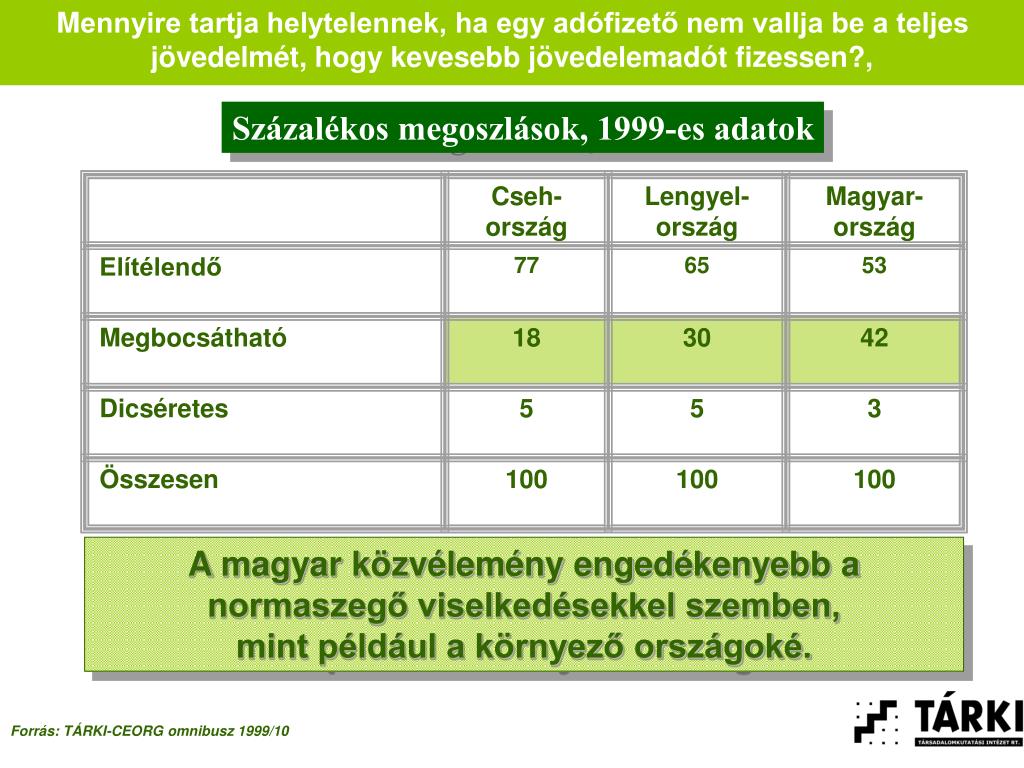 Cseh-ország Lengyel-ország Magyar-ország Elítélendő 77 65 53 Megbocsátható 18 30 42 Dicséretes 5 5 3 Összesen 100 100 100 Mennyire tartja helytelennek, ha egy adófizető nem vallja be a teljes jövedelmét, hogy kevesebb jövedelemadót fizessen?, Százalékos megoszlások, 1999-es adatok A magyar közvélemény engedékenyebb a normaszegő viselkedésekkel szemben, mint például a környező országoké. Forrás: TÁRKI-CEORG omnibusz 1999/10