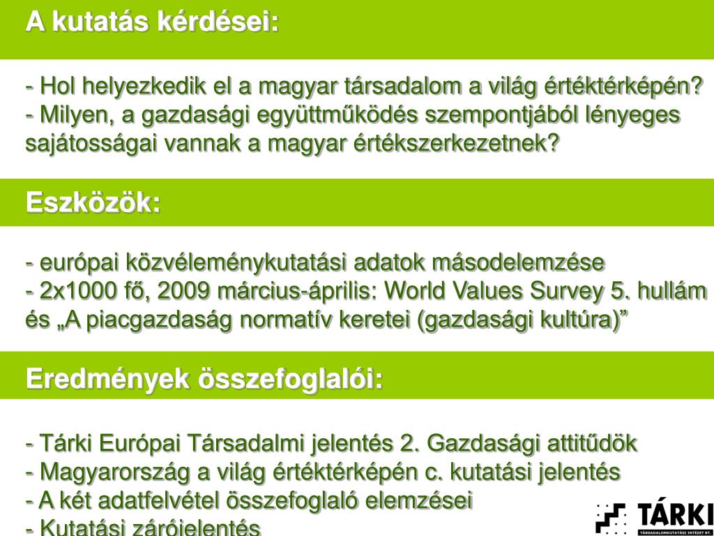 A kutatás kérdései: • Hol helyezkedik el a magyar társadalom a világ értéktérképén? • Milyen, a gazdasági együttműködés szempontjából lényeges • sajátosságai vannak a magyar értékszerkezetnek? • Eszközök: • európai közvéleménykutatási adatok másodelemzése • - 2x1000 fő, 2009 március-április: World Values Survey 5. hullám • és „A piacgazdaság normatív keretei (gazdasági kultúra)” • Eredmények összefoglalói: • Tárki Európai Társadalmi jelentés 2. Gazdasági attitűdök • Magyarország a világ értéktérképén c. kutatási jelentés • A két adatfelvétel összefoglaló elemzései • Kutatási zárójelentés