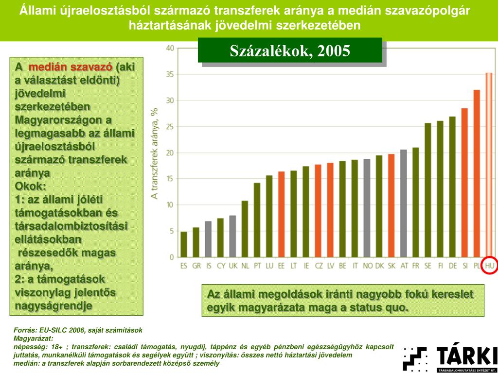 Állami újraelosztásból származó transzferek aránya a medián szavazópolgár háztartásának jövedelmi szerkezetében Százalékok, 2005 A medián szavazó(aki a választást eldönti) jövedelmi szerkezetében Magyarországon a legmagasabb az állami újraelosztásból származó transzferek aránya Okok: 1: az állami jóléti támogatásokban és társadalombiztosítási ellátásokban részesedők magas aránya, 2: a támogatások viszonylag jelentős nagyságrendje Az állami megoldások iránti nagyobb fokú kereslet egyik magyarázata maga a status quo. Forrás: EU-SILC 2006, saját számítások Magyarázat: népesség: 18+ ; transzferek: családi támogatás, nyugdíj, táppénz és egyéb pénzbeni egészségügyhöz kapcsolt juttatás, munkanélküli támogatások és segélyek együtt ; viszonyítás: összes nettó háztartási jövedelem medián: a transzferek alapján sorbarendezett középső személy