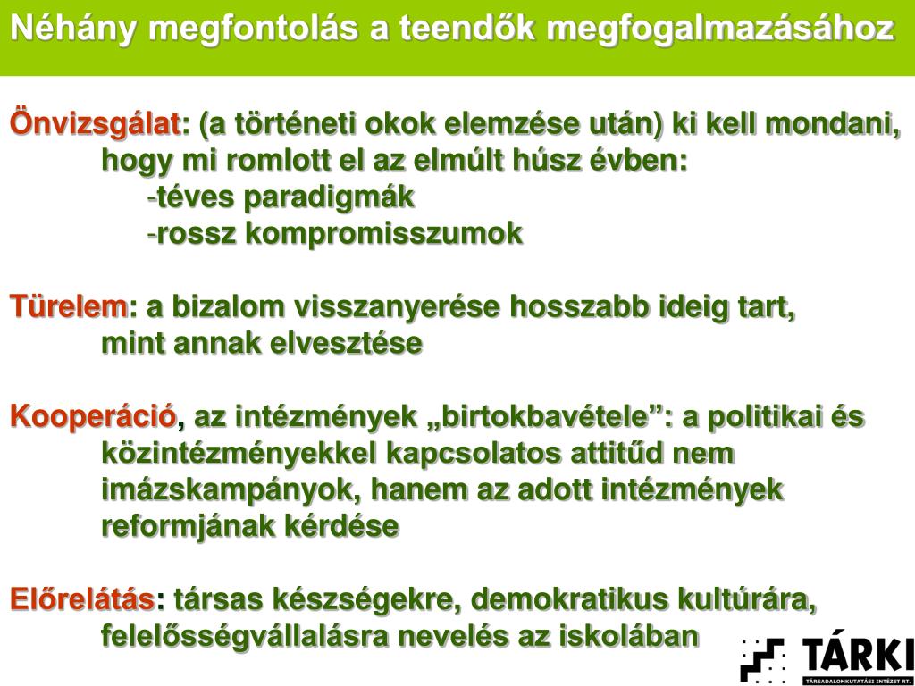 Néhány megfontolás a teendők megfogalmazásához • Önvizsgálat: (a történeti okok elemzése után) ki kell mondani, • hogy mi romlott el az elmúlt húsz évben: • téves paradigmák • rossz kompromisszumok • Türelem: a bizalom visszanyerése hosszabb ideig tart, • mint annak elvesztése • Kooperáció, az intézmények „birtokbavétele”: a politikai és • közintézményekkel kapcsolatos attitűd nem • imázskampányok, hanem az adott intézmények • reformjának kérdése • Előrelátás: társas készségekre, demokratikus kultúrára, • felelősségvállalásra nevelés az iskolában