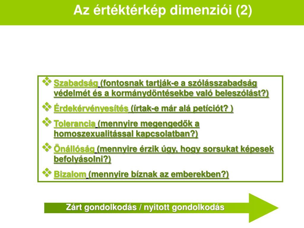 Az értéktérkép dimenziói (2) • Szabadság(fontosnak tartják-e a szólásszabadság védelmét és a kormánydöntésekbe való beleszólást?) • Érdekérvényesítés (írtak-e már alá petíciót? ) • Tolerancia(mennyire megengedők a homoszexualitással kapcsolatban?) • Önállóság(mennyire érzik úgy, hogy sorsukat képesek befolyásolni?) • Bizalom(mennyire bíznak az emberekben?) Zárt gondolkodás / nyitott gondolkodás