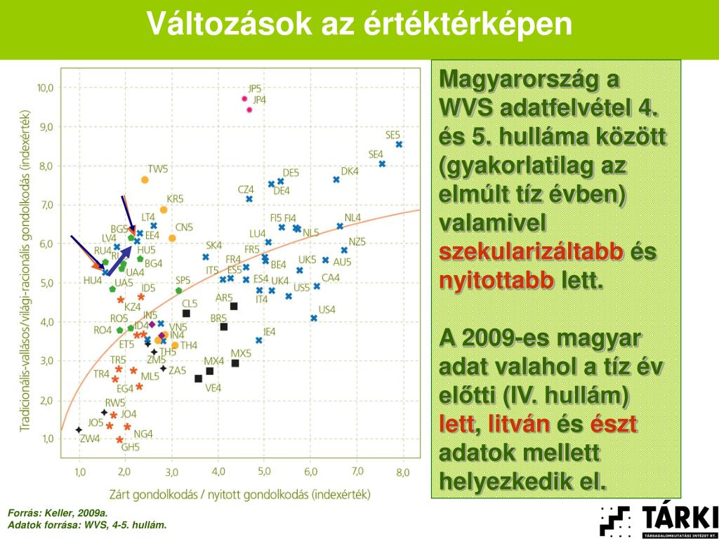Változások az értéktérképen Magyarország a WVS adatfelvétel 4. és 5. hulláma között (gyakorlatilag az elmúlt tíz évben) valamivel szekularizáltabb és nyitottabb lett. A 2009-es magyar adat valahol a tíz év előtti (IV. hullám) lett, litván és észt adatok mellett helyezkedik el. Forrás: Keller, 2009a. Adatok forrása: WVS, 4-5. hullám.