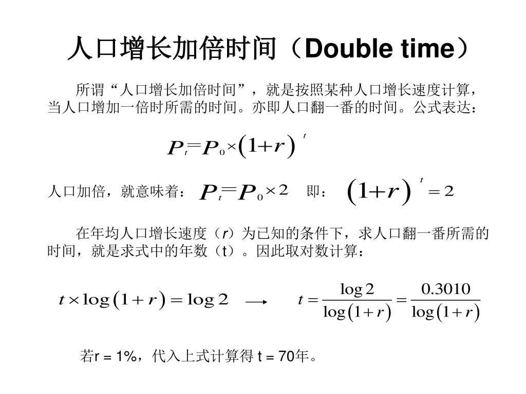 人口增长加倍时间(Double time) 所谓“人口增长加倍时间”,就是按照某种人口增长速度计算,当人口增加一倍时所需的时间。亦即人口翻一番的时间。公式表达: 人口加倍,就意味着: 即: 在年均人口增长速度(r)为已知的条件下,求人口翻一番所需的时间,就是求式中的年数(t)。因此取对数计算: 若r = 1%,代入上式计算得 t = 70年。