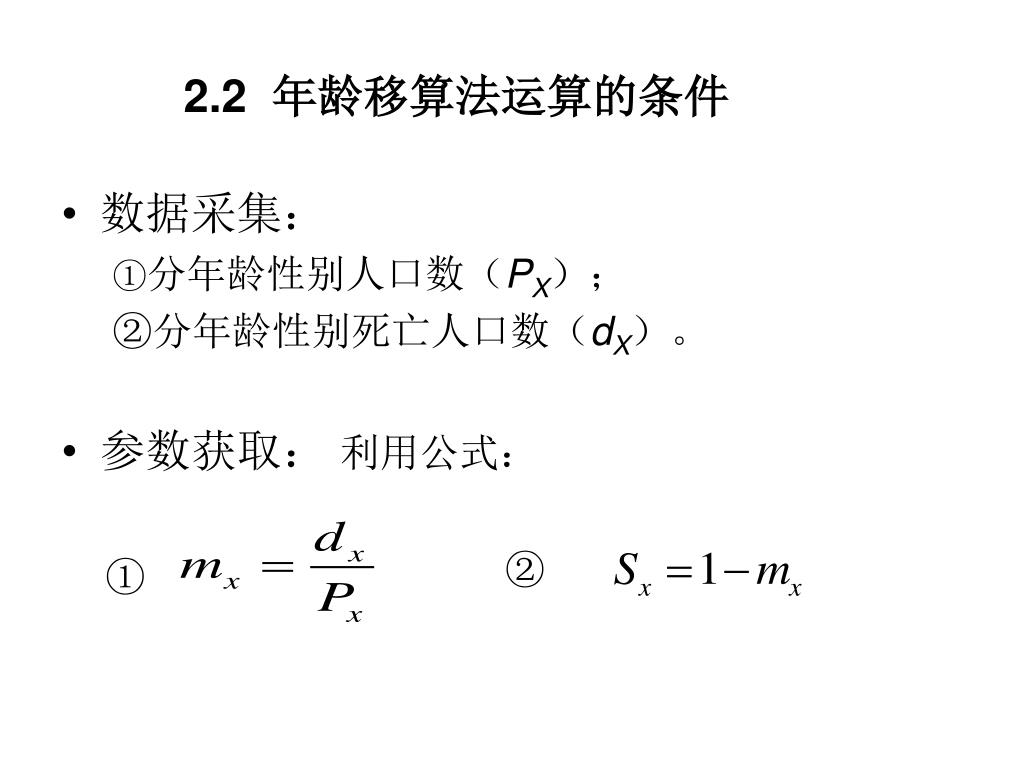 2.2 年龄移算法运算的条件 • 数据采集: ①分年龄性别人口数(PX); ②分年龄性别死亡人口数(dX)。 • 参数获取: 利用公式: ① ②