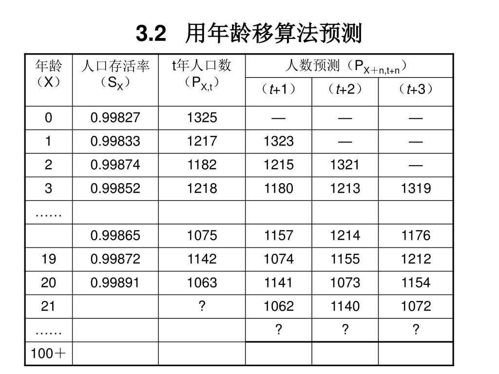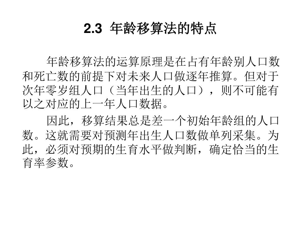 2.3 年龄移算法的特点 年龄移算法的运算原理是在占有年龄别人口数和死亡数的前提下对未来人口做逐年推算。但对于次年零岁组人口(当年出生的人口),则不可能有以之对应的上一年人口数据。 因此,移算结果总是差一个初始年龄组的人口数。这就需要对预测年出生人口数做单列采集。为此,必须对预期的生育水平做判断,确定恰当的生育率参数。