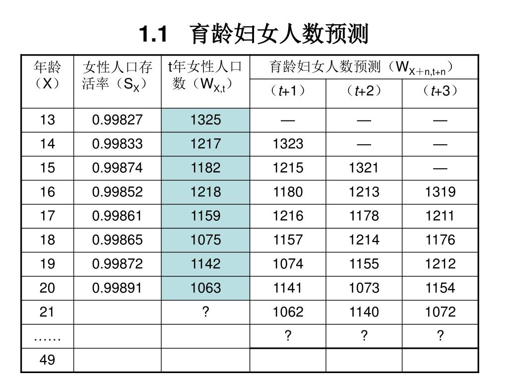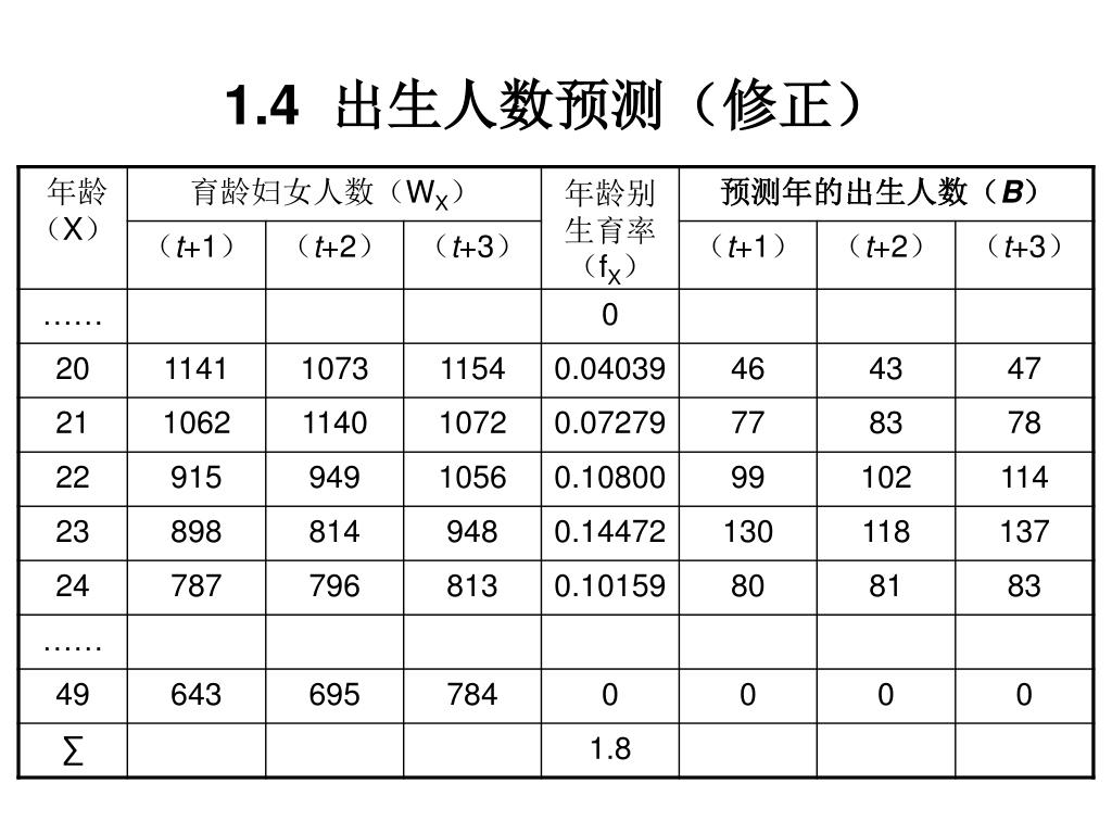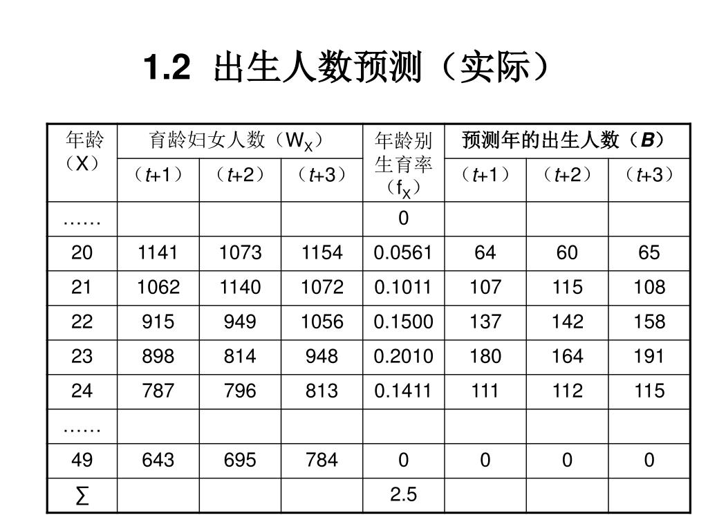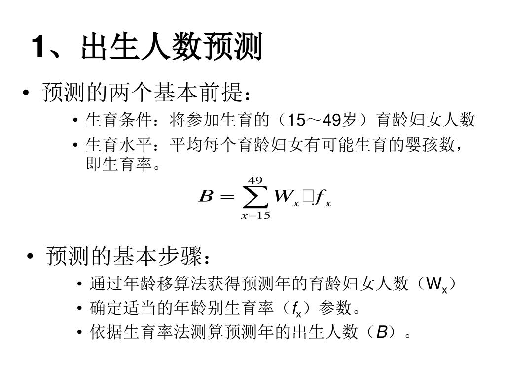 1、出生人数预测 • 预测的两个基本前提: • 生育条件:将参加生育的(15~49岁)育龄妇女人数 • 生育水平:平均每个育龄妇女有可能生育的婴孩数,即生育率。 • 预测的基本步骤: • 通过年龄移算法获得预测年的育龄妇女人数(Wx) • 确定适当的年龄别生育率(fx)参数。 • 依据生育率法测算预测年的出生人数(B)。