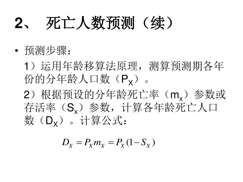 2、 死亡人数预测(续) • 预测步骤: 1)运用年龄移算法原理,测算预测期各年份的分年龄人口数(PX)。 2)根据预设的分年龄死亡率(mx)参数或存活率(Sx)参数,计算各年龄死亡人口数(DX)。计算公式: