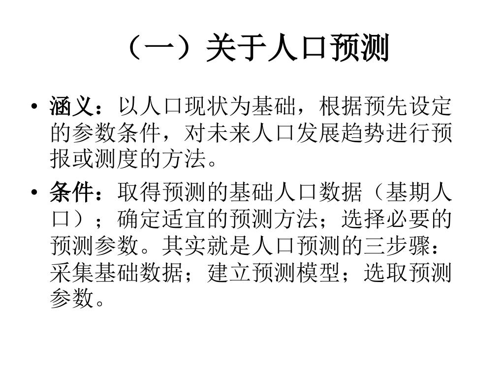 (一)关于人口预测 • 涵义:以人口现状为基础,根据预先设定的参数条件,对未来人口发展趋势进行预报或测度的方法。 • 条件:取得预测的基础人口数据(基期人口);确定适宜的预测方法;选择必要的预测参数。其实就是人口预测的三步骤:采集基础数据;建立预测模型;选取预测参数。