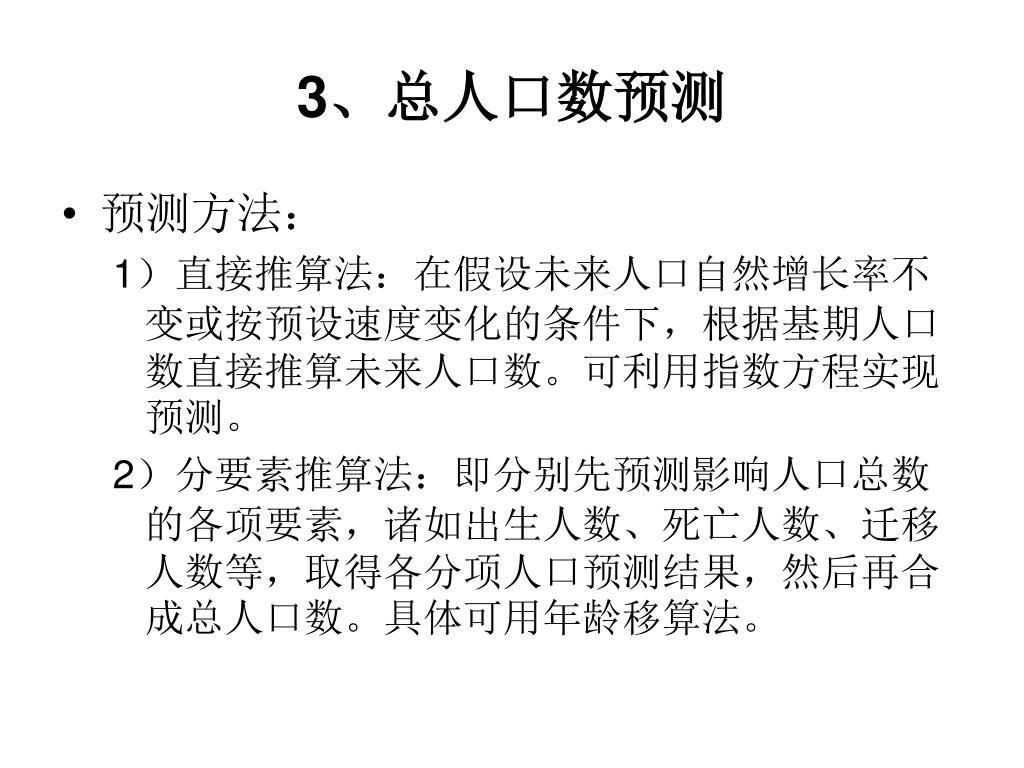 3、总人口数预测 • 预测方法: 1)直接推算法:在假设未来人口自然增长率不变或按预设速度变化的条件下,根据基期人口数直接推算未来人口数。可利用指数方程实现预测。 2)分要素推算法:即分别先预测影响人口总数的各项要素,诸如出生人数、死亡人数、迁移人数等,取得各分项人口预测结果,然后再合成总人口数。具体可用年龄移算法。