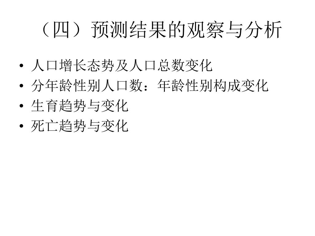 (四)预测结果的观察与分析 • 人口增长态势及人口总数变化 • 分年龄性别人口数:年龄性别构成变化 • 生育趋势与变化 • 死亡趋势与变化