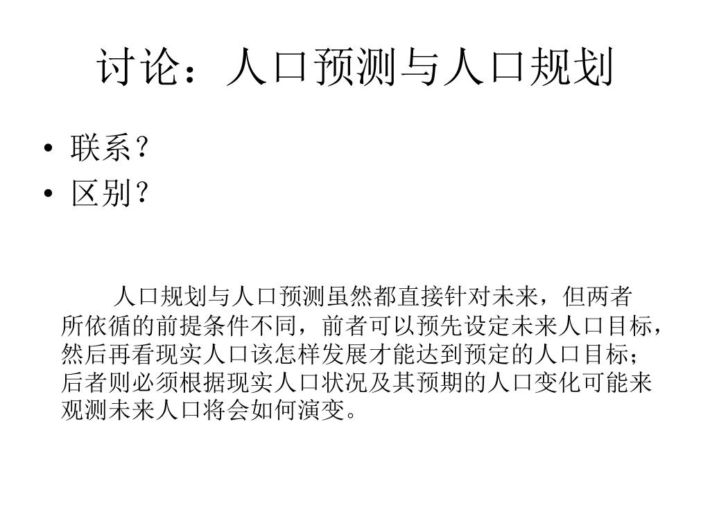讨论:人口预测与人口规划 • 联系? • 区别? 人口规划与人口预测虽然都直接针对未来,但两者所依循的前提条件不同,前者可以预先设定未来人口目标,然后再看现实人口该怎样发展才能达到预定的人口目标;后者则必须根据现实人口状况及其预期的人口变化可能来观测未来人口将会如何演变。