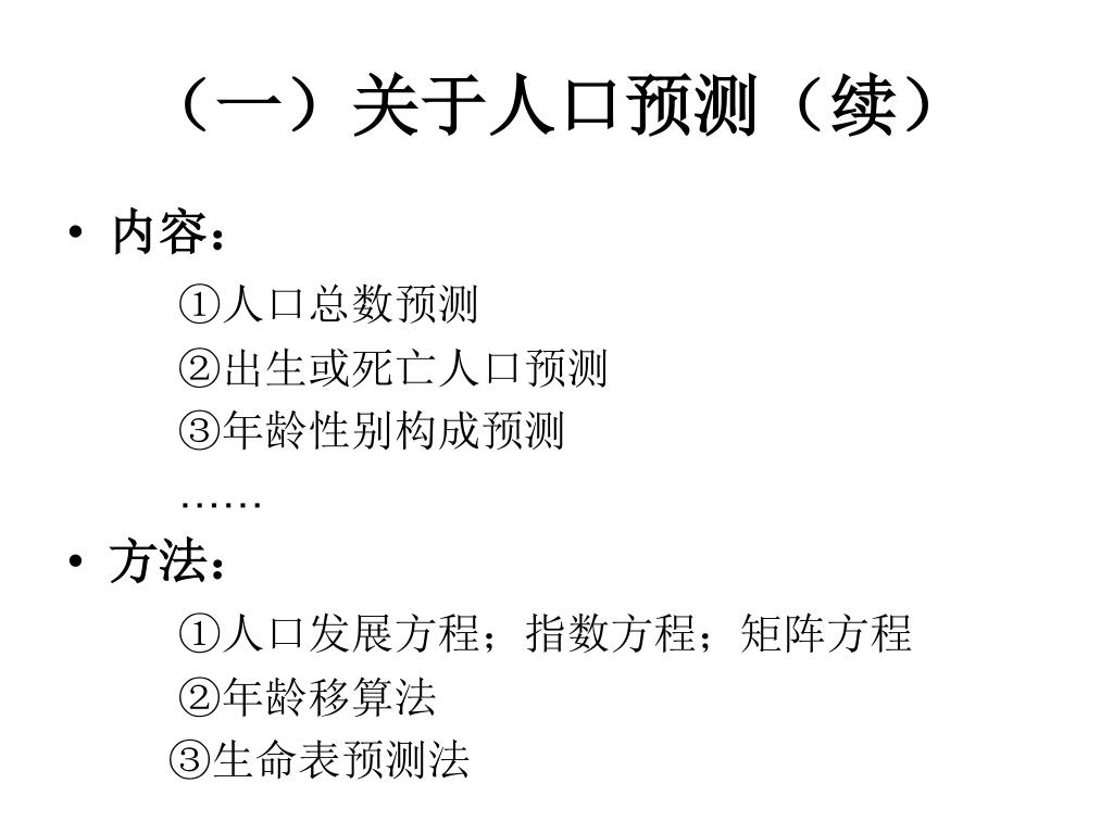(一)关于人口预测(续) • 内容: ①人口总数预测 ②出生或死亡人口预测 ③年龄性别构成预测 …… • 方法: ①人口发展方程;指数方程;矩阵方程 ②年龄移算法 ③生命表预测法
